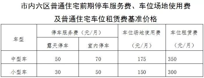 (一)普通住宅车位租赁费和普通住宅前期物业停车服务费、车位场地使用费实行政府指导价,市内六区普通住宅车位租赁费和普通住宅前期物业停车服务费、车位场地使用费标准由市发展改革部门会同市物业主管部门制定,具体收费标准见下表。