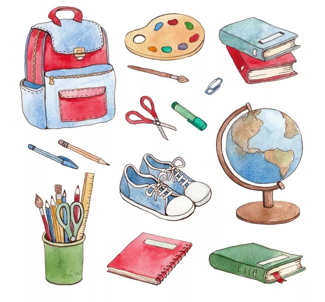 1. 笔、笔记本、彩色笔、文具袋、