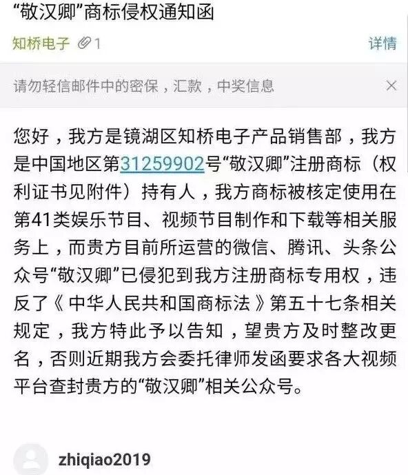 对方在发给他的邮件中称,敬汉卿目前运营的微信、腾讯、头条公众号所用“敬汉卿”已侵犯到他们的注册商标专用权。对方要求敬汉卿及时整改更名,否则将委托律师发函,要求各大视频平台查封“敬汉卿”相关账号。
