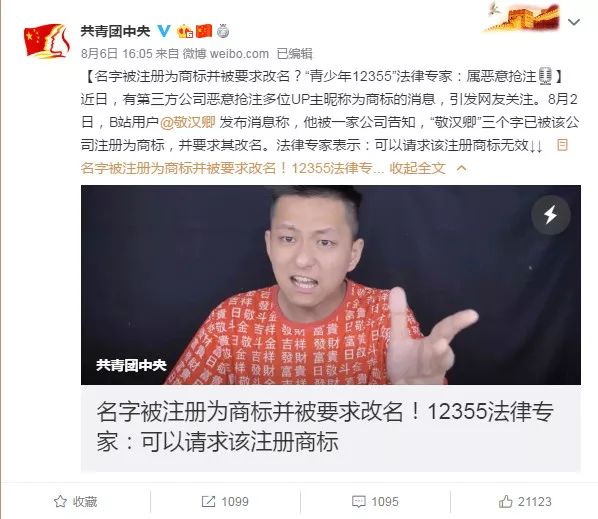 而近日共青团方面也针对此事做出了回应,称该商标权人的行为属于恶意抢注商标行为,UP主可以请求该注册商标无效。如果因商标注册人的恶意给其造成损失的,还可以依法主张损害赔偿。
