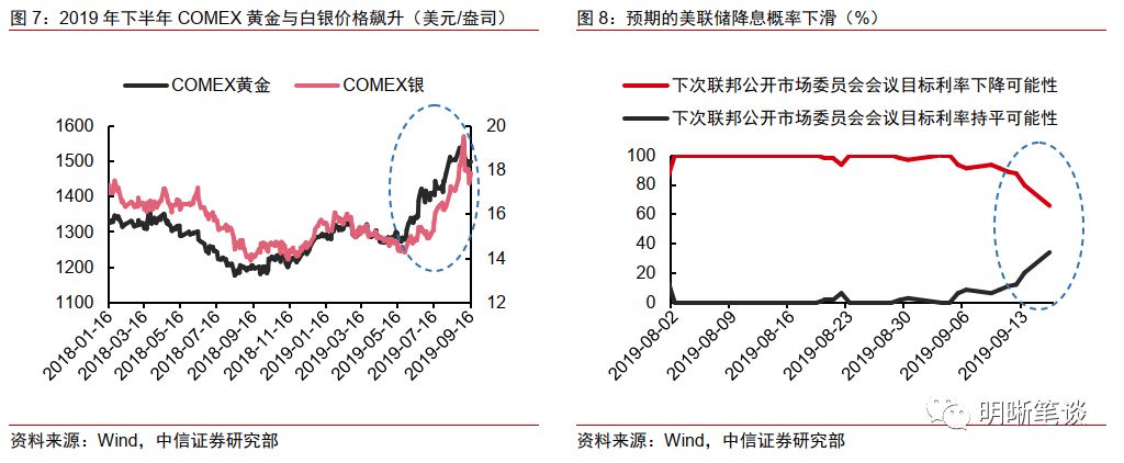 近两周美债利率快速上行主要是由于避险情绪边际消退。近几周频频传出全球局势缓和的利好消息,包括中美贸易谈判互表善意,英国“硬脱欧”可能性下降,美伊关系有缓和迹象等,全球避险情绪快速趋弱。特朗普9月11日在推特上宣布将推迟加征中国商品关税,中方商务部发言人12日在新闻发布会表示双方第十三轮经贸高级别磋商正在安排,中方企业已经开始就采购美国农产品进行询价。美国经济仍有支撑,上周美国公布的通胀数据好于预期,就业数据也相对稳健,市场避险情绪边际消退。今年6月以来一路上涨的COMEX金价与银价也分别回调3.14%与4.56%,10年期美债收益率从8月底的1.47%一路上行约40bp至9月13日的1.9%。