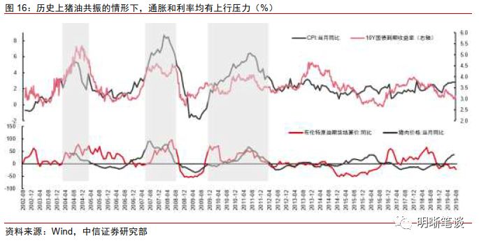历史上猪油共振的情形下,通胀和利率均有上行压力。作为对国内物价影响最大的两个因素,猪肉价格和国际油价共振上行的时期往往对应较大的通胀压力,政策被迫收紧以对冲通胀上行的影响,从而导致利率明显上行或维持高位。2004年、2007年和2011年前后均出现过类似的情形。但是2012年至今,猪油走出分化行情,再没有共振行情出现,国内CPI的波动率在这段时期里也有明显下降。时过境迁,即使再次出现猪油共振,对经济的影响可能也会与10年前有所区别。