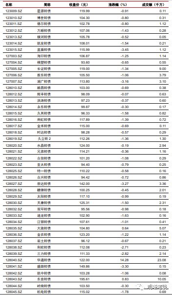 9月17日转债市场,平价指数收于91.59点,下跌1.85%,转债指数收于111.16点,下跌1.07%。178支上市可交易转债,除海澜转债、华森转债横盘外,12支上涨,164支下跌。其中,华通转债(14.28%)、联泰转债(2.32%)、安图转债(1.42%)领涨,广电转债(-5.51%)、凯龙转债(-5.00%)、圣达转债(-4.70%)领跌。178支可转债正股,除蓝思科技横盘外,21支上涨,156支下跌。其中,华通医药(10.00%)、铁汉生态(3.54%)、清水源(3.24%)领涨,蓝盾股份(-6.61%)、和而泰(-6.00%)、贵广网络(-5.71%)领跌。