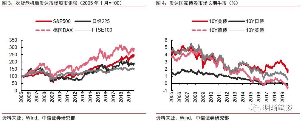 全球宽松导致负利率和高资产价格并存。次贷危机以后,发达市场大致走出了长期的“股债双牛”行情,长期的大规模量化宽松政策让发达经济体利率水平不断下滑的同时,资产价格不断创新高。从全球负利率债券规模来看,自从日本和欧洲央行开始实施负利率政策以来,全球负利率债券规模迎来一波快速上涨。经过了几年的波动下行后,负利率债券自去年年底再次开启了新一轮规模扩张,随着全球降息潮来临,扩张节奏也明显加快。从股市和债市看,主要发达经济体股票市场和债券市场在次贷危机以后大都经历了长期的牛市,股票价格上涨,债券收益率下行,对应的资产价格都来到了历史高位。