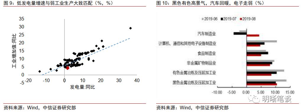 工业生产表现相对萎靡,工业增加值增速降至历史低位。8月工业生产表现较弱,当月同比增速仅为4.4%,大幅低于预期,依旧呈现出季末冲量后补偿性回落的特点。中小银行信用收缩的影响逐渐兑现,私营企业和股份制企业生产增速连续两月下滑,国企和外资生产增速回升,不同资质的企业景气度开始分化。分行业来看,黑色、有色、非金属矿物制造业增加值增速仍高,房地产和基建是重要的助推因素。汽车制造业改善,增加值增速回正,计算机、通信、电子增速有比较明显的下行。