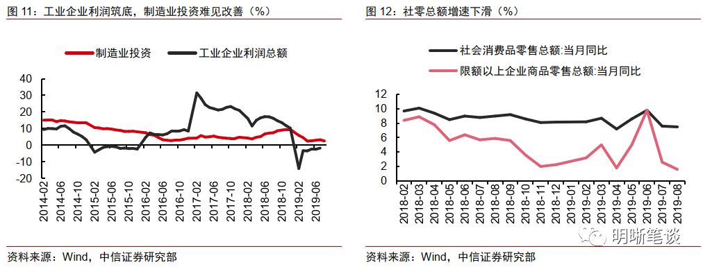 汽车销售对消费形成较大的下拉作用,消费短期有触底迹象。今年消费表现较弱(6月除外),汽车销售放缓是重要的影响因素。由于汽车零售绝大多数对应限额以上企业,因此看到限额以上企业商品零售总额增速已经下降到历史低位,且跟随汽车消费有较大幅度的波动。随着“金九银十”消费旺季到来,服装换季、房屋竣工加速等可能促使服装鞋帽类、地产后周期类零售小幅反弹的趋势持续,近期部分城市逐步放松车辆限购政策,短期消费可能接近触底。