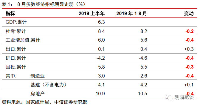 周一公布的8月经济数据悉数下行,对三季度乃至全年GDP形成较大压力。从各个主要分项的累计同比数据来看,除了外贸方面的变动方向边际上对GDP有利之外,消费、投资、生产都会或多或少的拉低三季度乃至全年的GDP水平,如果四季度经济没有边际改善,GDP存在不达目标的风险。考虑到年内专项债提振基建的空间可能有限,那么除了货币宽松之外,政策的选项似乎不多。