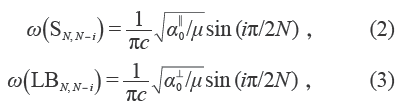 其中i = 1,2,⋯,N - 1,频率最高的模式记为SN, 1和LBN, 1,而频率最低的模式记为SN, N-1和LBN, N-1,式中1/πc√(α∥0 /μ) = ω(Sbulk) 和1/πc√(α⊥0 /μ) = ω(LBbulk) 为对应体材料的频率。由于S模和LB模的频率直接与二维材料的层间耦合力常数相联系,因此可以通过拉曼光谱探测S模和LB模的频率来实验确定相应二维材料的层间耦合力常数。若将两层二维材料的S2, 1 和LB2, 1 归一到1, 则体材料对应的ω(Sbulk) 和ω(LBbulk) 频率为√2 ,如图2(a),(b)所示。当中显示出N层二维材料的S模和LB模对层数具有很强的依赖性。根据(1)公式还可以计算出第i个S模或LB模的本征位移矢量ν(i)j 为