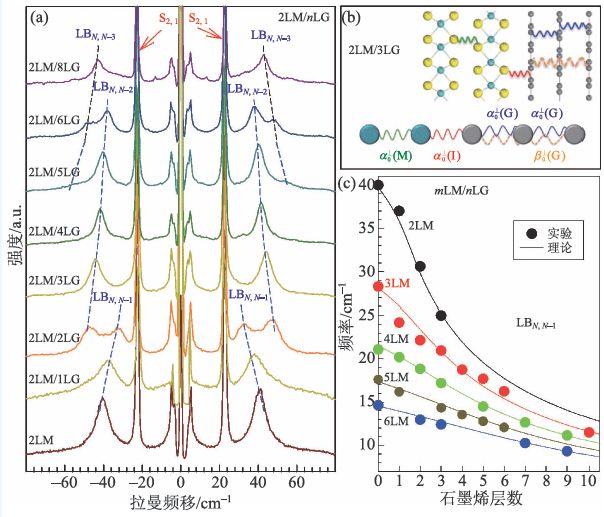 图6 (a)双层MoS2/n 层石墨烯(2LM/nLG)在S和LB模范围的拉曼光谱;(b)2LM/3LG中LB模对应的线性链模型;(c)mLM/nLG中LBN, N-1的频率随石墨烯层数n 的变化规律及实验测得的LB模频率[24]