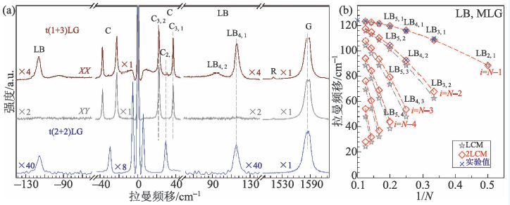 图5 (a) t(2+2)LG 以及平行和交叉偏振下t(1+3)LG 在C、LB模以及G模频率范围内的拉曼光谱[31];(b)根据最近邻(LCM)和次近邻(2LCM)线性链模型计算的LB模频率,分别用灰色五角星以及红色菱形表示,蓝色叉“×”为实验测得LB模频率[27]