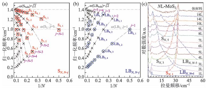 图2 层数为N的二维材料的(a)S 模和(b)LB 模的归一化频率[35],将两层二维材料的S模和LB模频率分别归一化到1;(c)2H堆垛的1—18 层MoS2以及体材料在S模和LB模区域的拉曼光谱[33],实验所测得的相应归一化频率用红色正方形和蓝色圆圈分别标记在(a)和(b)中