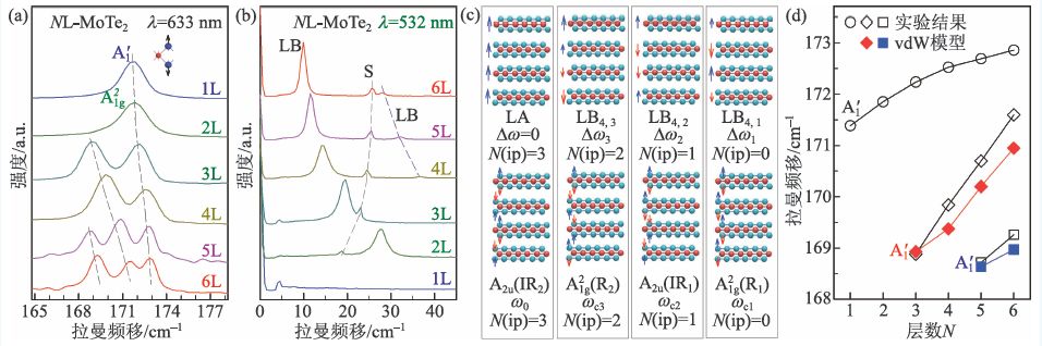单层二维材料的一个高频层内振动声子模在N层二维材料中将劈裂为N个相应的高频模,发生Davydov 劈裂现象。由于层间存在范德瓦尔斯力,层间最近邻原子间沿相同或相反方向运动的两个振动模的频率稍有差异,如图4(a)所示。这种不同Davydov 劈裂峰之间的频率差异反映了二维材料范德瓦尔斯层间相互作用的大小,因此多层二维材料的层内振动声子模的频率也依赖于层间耦合和层数。假设单层二维材料层内振动声子模频率为ω0 ,在相应的N层二维材料中,层间最近邻原子间沿相同方向运动的振动模式频率也为ω0 。而一旦高频层内振动声子模的层间最近邻原子间存在沿相反方向的振动位移,这时层间最近邻原子间存在范德瓦尔斯相互作用,也存在对应的层间范德瓦尔斯耦合振动模,即相应的S 模或LB 模。这时S 模或LB 模的频率就是层间范德瓦尔斯相互作用的耦合频率Δω 。这样,在一级近似下即可建立范德瓦尔斯模型[42],该层间范德瓦尔斯相互作用导致对应的高频层内振动声子模的频率为ωc = √(ω02 + Δω2)。对于MoTe2 中的沿面外方向振动的类A′1模, Δω 对应的是LB 模的频率(图4(b))。以4 层MoTe2 为例,类A′1 模和LB 模的振动方式如图4(c)所示,可将层间振动方式相同的类A′1 模和LB模归为一组。其中, A2u(IR2) 层间无耦合,为频率最低的一支。对于每一层数MoTe2,最高频率的类A′1 模为拉曼活性,在拉曼光谱中始终可见。这里以该模式频率作为基准,根据范德瓦尔斯模型可计算其他各Davydov 劈裂峰的频率,结果如图4(d)所示,计算结果(实心正方形和菱形)与实验结果(空心正方形和菱形)比较接近。这种Davydov 劈裂现象也会出现在MoTe2的平面内振动中,也可推广到其他二维材料中[43,44]。