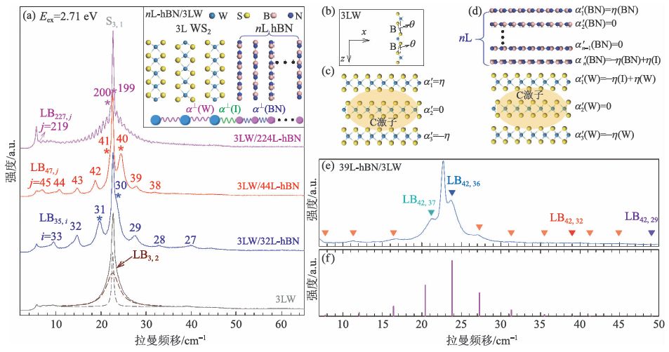 由前面的介绍可知,层间键极化率模型可用于计算少层二维材料中S 模和LB模的相对强度,2H堆垛的3LW中各层间极化键单位矢量(图7(b))与AB-3LG 类似, 有R ̂1, 2 = (sin θ,0, cos θ) ,R ̂2, 1 = -R ̂1, 2,R ̂2, 3 = ( -sin θ,0, cos θ ),R ̂3, 2 = -R ̂2, 3,因此χ′1z, xx = C*R ̂1z, 2 = η,χ′2z, xx = C*(R ̂2z, 1 +R ̂2z, 3) = 0,χ′3z, xx = C*R ̂3z, 2 = -η 。图7(c)显示了3LW对应于LB振动的各层极化率的变化。为了计算二维范德瓦尔斯异质结各LB 模的拉曼强度,我们将层间键极化率模型推广到了范德瓦尔斯异质结[23]。以nL-hBN/3LW为例,根据前面分析可知,在计算系统极化率变化量时, 仅需考虑hBN 组分的顶层、3LW组分的底层以及界面处相邻的hBN和WS2 层的层间键极化率对z 方向位移矢量的导数即可,其中hBN 组分的顶层和第二层hBN的层间键极化率导数为hBN 本身的层间键极化率导数,记为χ′1 (BN)= η (BN),第三层WS2和第二层WS2的层间键极化率导数为χ′3 (W)= -η (W),界面处hBN和WS2层的极化率导数分别为χ′n (BN)= -η(BN)+ η(I), χ′1 (W)= -η (I)+ η(W),如图7(d)所示。因此,nL-hBN/3LW异质结的极化率改变量为