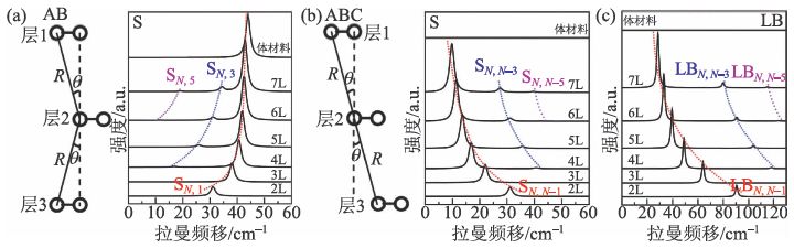 根据线性链模型, S3, 1 模的位移矢量为1/√1.5(0.5,1,0.5),S3, 2模的位移矢量为1/√2(1,0, - 1),因此Δχxx (AB,S3, 1) = √6 β,Δχxx (AB,S3, 2) = 0,而Δχxx (ABC,S3, 1) = 0,Δχxx (ABC,S3, 2 ) = √2 β 。根据I ∝ |Δχxx|2 可求得各模式的相对拉曼强度。该方法可推广到其他AB和ABC堆垛少层石墨烯中S模相对强度的计算,结果如图3(a),(b)所示。该计算结果与实验结果吻合得很好[32, 39, 41]。类似的,可求出两种堆垛方式LB 模的相对强度。对于AB和ABC堆垛的3LG均有