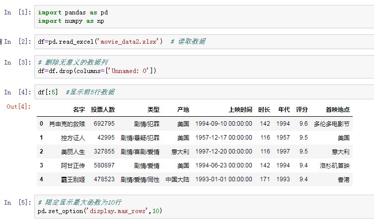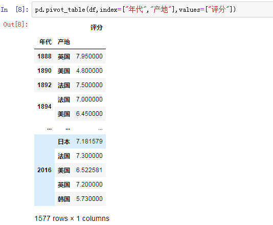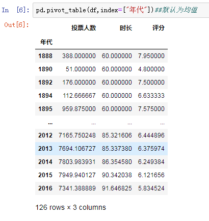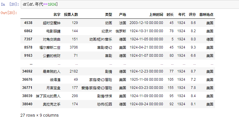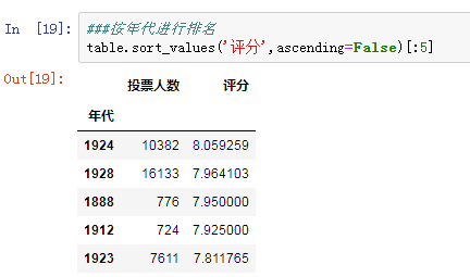 接下来我们按电影的年代进行排名,使用排序函数sort_values(),评分按照降序排序,设置ascending的值为False: