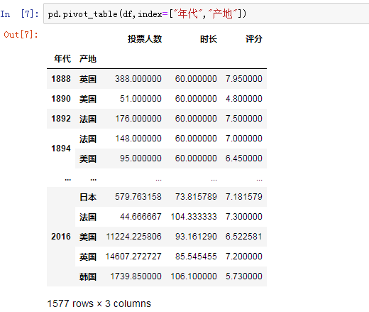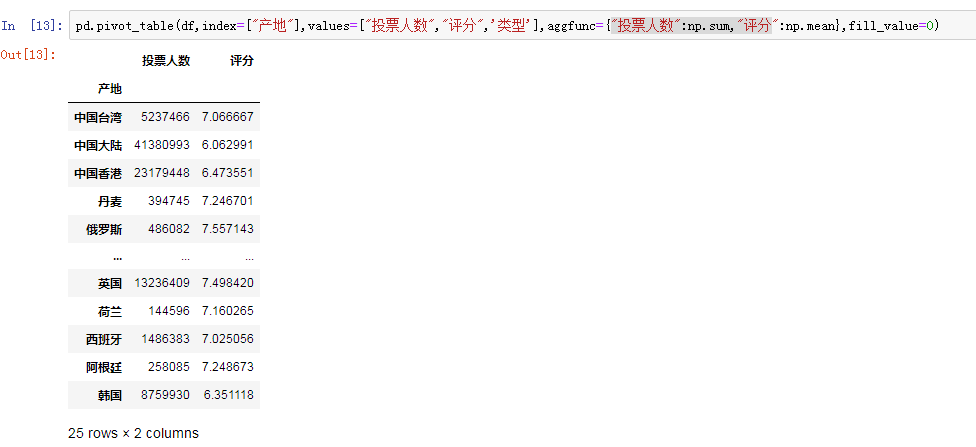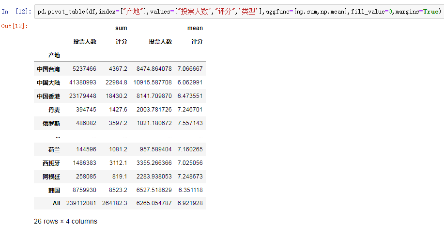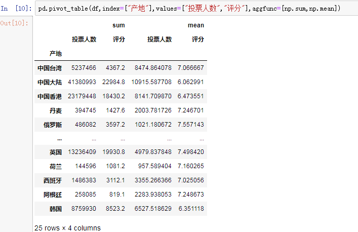 以产地为索引,通过将“投票人数”列和“评分”列进行对应分组,用sum函数计算总和,用mean计算数值均值: