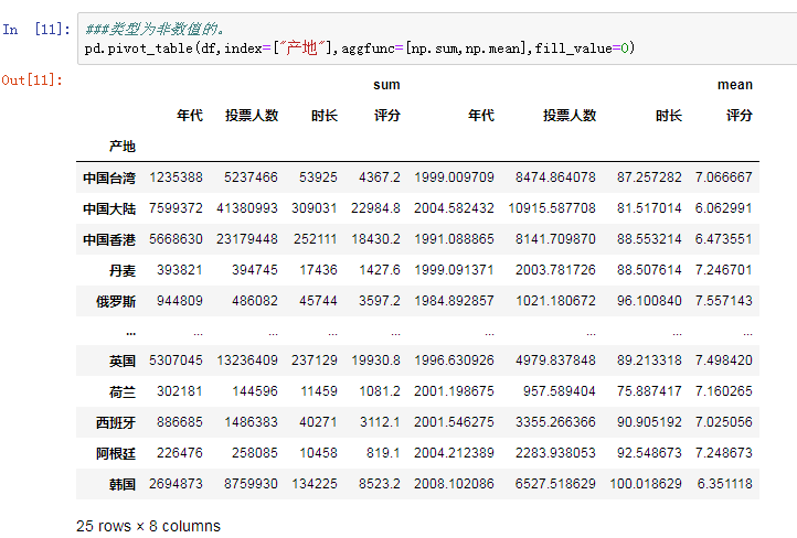aggfunc可以包含很多函数,下面让我们尝试用numpy中的sum和mean函数来进行分组计算。