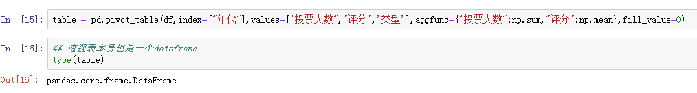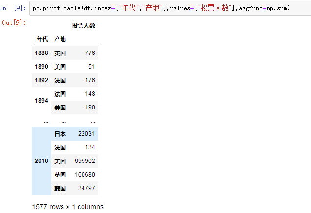 还可以指定函数来统计不同的统计值,使用aggfunc就很容易实现,比如在下图中使用Numpy的sum函数对投票人数求和: