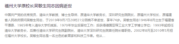 中国共产党的优秀党员,清华大学教授、博士生导师,原清华大学教务长、深圳研究生院院长,原福州大学校长,原福建省人民政府顾问吴敏生同志,于2019年9月7日20时21分因病不幸逝世,享年74岁。