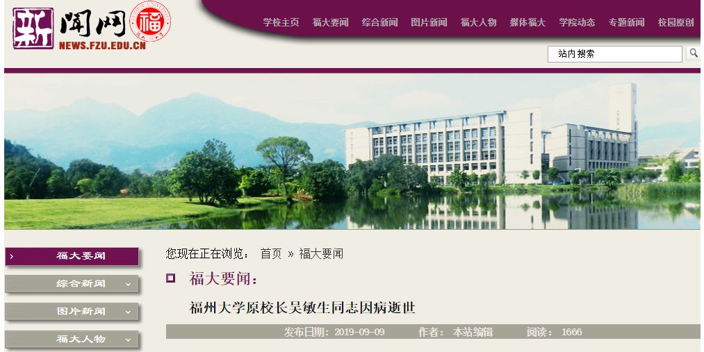 - 刚刚 福州大学官网发布消息! 福州大学原校长吴敏生因病逝世! 吴敏生,1946年8月出生于福建省平潭县,1965年考入清华大学机械系,1970年毕业后留校工作;后获得德国亚琛工业大学工学博士学位;