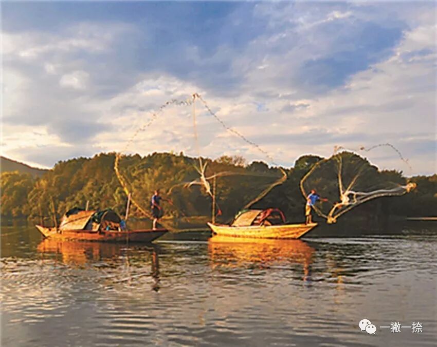 图为浙江丽水市“古堰画乡”小镇的渔民在瓯江上撒网捕鱼。近年来,丽水市莲都区本着保护和开发并重的原则,淘汰污染企业、修复沿线河道、实施生态补水工程,使水更清、天更蓝。