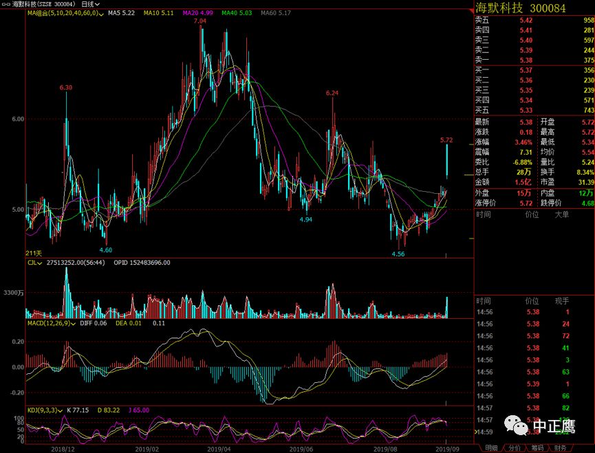 最后我说一下A股,国庆节之前依旧可以看好。我们要说的就是一支票,今天早上有群友发红包是分享海默科技。因为这支票老鹰之前也做过,我是在七块多之前就走掉了,所以这段时间一直没有关注。这票居然被拉到国防军工概念里,我没看是哪一块业务,只知道该股是与石油开采设备有关的。像这种股票质地还行,但一定是原油上涨,它才能带来好的机会。当原油下跌,如果老鹰原油后期是要看下跌的话,该类股暂时就不宜参与,所以今天早上他就逢高卖出,应该是一个很好的卖点。像这种墓碑线我们后头就不再介入,不理它了。