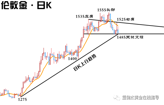 3、黄金头肩顶暂时初步完成,当前处于右肩的下行走势,能否破位颈线支撑相当关键,预计短线上还会从1485开始一次反弹,但是反弹之后还要沽空去博颈线位置!