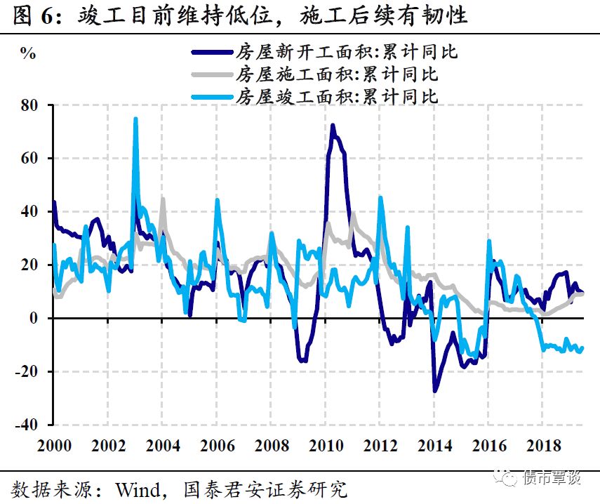 当前地产投资具有内在韧性。2019年地产投资在2018年高基数上取得高增速,但是内在逻辑已由土地购置拉动,逐渐向施工和建安投资支撑切换。考虑到前期新开工和施工的缺口,如果竣工仍然维持相对低位,那么开工向施工的转化仍将持续,年内地产投资就难以出现断崖式下跌。考虑到施工的拉动链条比土地购置更长,从拉动实体经济含义上,地产投资数据的“质量”将会变好。