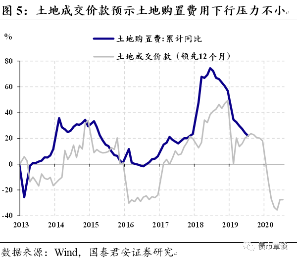土地购置费用部分增速下行压力不小。根据当前政策,土地成交后,部分土地价款可以最晚一年内结清,所以土地购置费用相对土地成交价款有12个月滞后。在融资端受限、销售端“房住不炒”的背景下,土地成交价款已经显著回落,这意味着占比40%左右的土地购置费用有较大的下行压力。