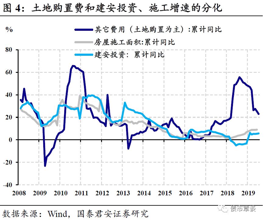 背后逻辑在于:去库存之后,地产企业拿地补库的诉求较强,但是拿地之后,在资金压力下普遍采取了高周转、抢预售的政策,造成了新开工和施工、竣工的背离。由于建安投资和施工面积更相关,造成了土地购置费确认和建安投资的背离。目前两者的趋势正在趋同,对于未来的地产投资的判断需要从这两部分的走势出发。