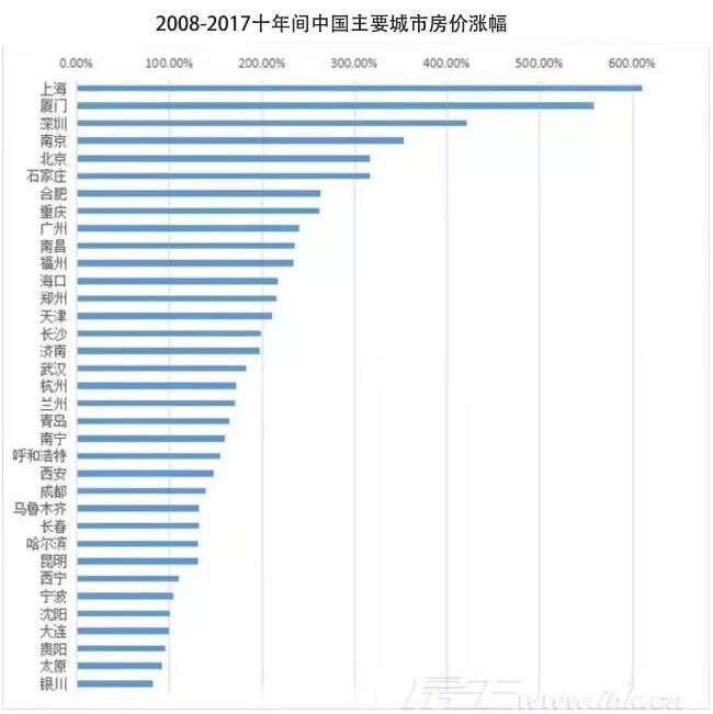我们再来看看近十年中国主要城市房价的涨幅,涨幅最高的上海已经超过了600%!