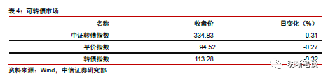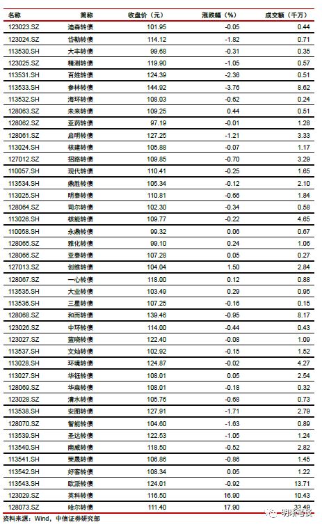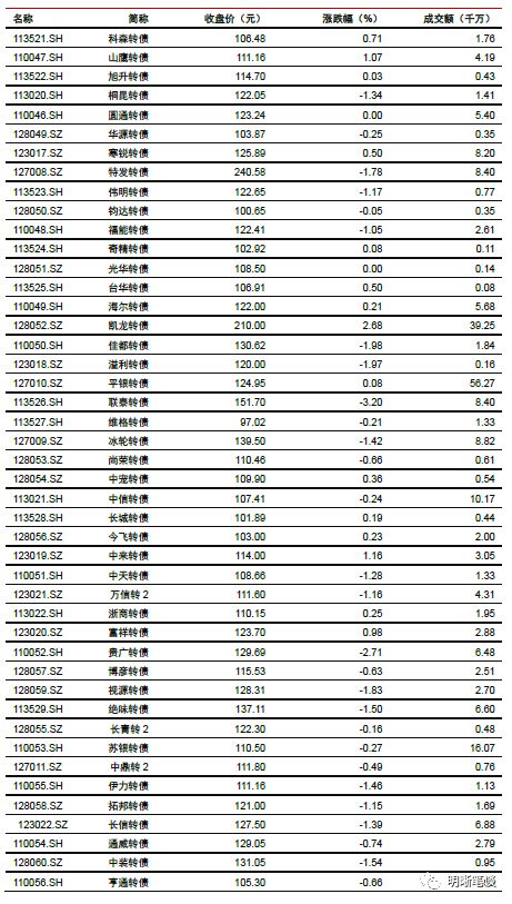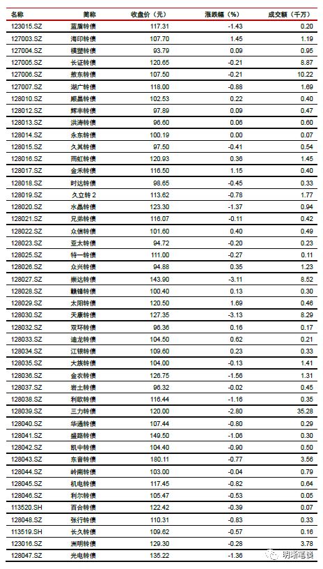 9月11日转债市场,平价指数收于94.52点,下跌0.27%,转债指数收于113.28点,下跌0.32%。175支上市可交易转债,除永东转债、圆通转债、光华转债、国贸转债横盘外,56支上涨,115支下跌。其中,哈尔转债(17.90%)、英科转债(16.90%)、凯龙转债(2.68%)领涨,参林转债(-3.76%)、联泰转债(-3.20%)、天康转债(-3.13%)领跌。175支可转债正股,除中国核电、凯龙股份、圆通速递、众信旅游、吉视传媒、光大银行、内蒙华电横盘外,43支上涨,125支下跌。其中,三力士(9.31%)、创维数字(7.64%)、德尔股份(5.69%)领涨,中装建设(-5.18%)、安图生物(-3.96%)、岱勒新材(-3.89%)领跌。