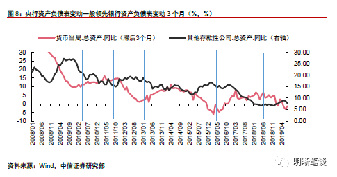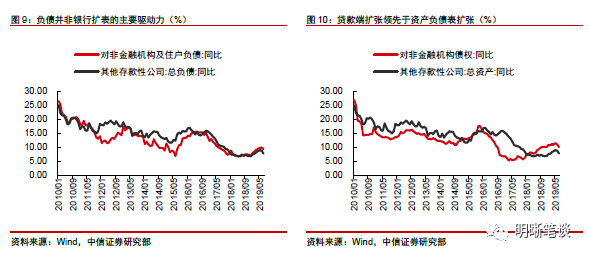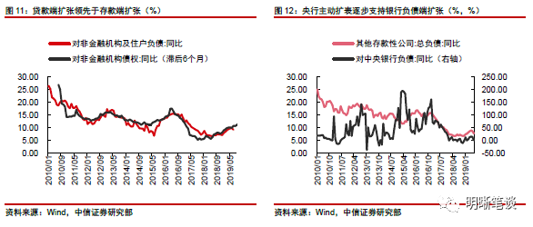 央行——银行的资产负债表传导有两条路径:(1)央行降准被动缩表最终需要银行贷款扩张才能驱动银行扩表,(2)央行主动扩表并推动银行负债端扩张完成扩表过程。对于央行货币宽松而言,数量工具方面包括降准和加大公开市场流动性投放,前者是央行被动缩表,后者是央行主动扩表。根据前面的分析,央行降准是通过银资产端扩张驱动银行扩表,加大公开市场操作则是通过银行负债端扩张渠道银行扩表,而银行负债扩张是被动性的而资产扩张则带有主动性。因而在2016年央行主动扩表阶段能维持银行资产负债表扩张,而2018以来央行被动缩表却难以带来银行扩表。