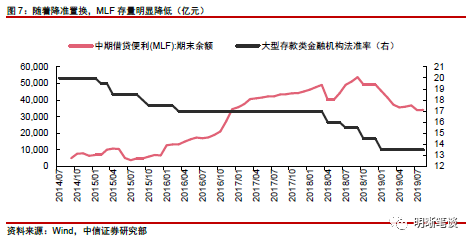 短期来看降准和MLF操作是可以替代的,中长期看并不能替代。今年年初的降准置换MLF后市场对全面降准后就会置换MLF形成的定式思维,实际上并不合理。首先,年初降准力度大,对冲1季度到期的MLF后仍然有8000亿元净投放,而本次全面降准+定向降准释放的资金量只9000亿元左右,若完全对冲MLF到期,则降准的政策效果难以显现。另一方面,如果一直怀抱这一定式思维,后续降准均需要置换MLF到期,则MLF存量逐渐降低意味着降准空间也缩小。