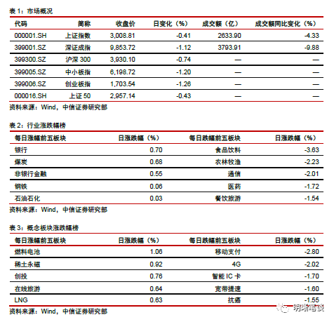 2019年9月11日,银存间质押式回购加权利率涨跌互现,隔夜、7天、14天、21天和1个月分别变动了-10.08bps、2.12bps、9.08bps、-6.24bps和-1.81bps至2.45%、2.64%、2.73%、2.66%和2.90%。国债到期收益率涨跌互现,1年、3年、5年、10年分别变动-0.81bps、0.55bps、-0.29bps、1.00bps至2.61%、2.75%、2.95%、3.05%。上证综指下跌0.41%至3008.81,深证成指下跌1.12%至9853.72,创业板指下跌1.26%至1,703.54。