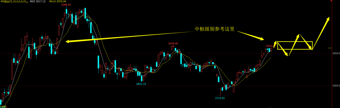 如果有背驰出现,则后市的剧本就非常简单:构筑一个30分中枢(1D3级别),该中枢级别也就是这几天一直强调的要参考的3月份那个中枢,之后再来一波!用日线图表达就是如下: