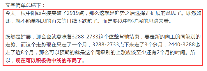 从2733点上来的这波行情,已经持续一个多月了,涨幅大的已经超过一倍,大部分个股都在拐头向上,尤其是从9月2日那根中阳线起,个股向上的趋势都已明朗,当日收盘就立刻写了《可以积极做中线布局了》,为什么?答案就在当天的解盘里: