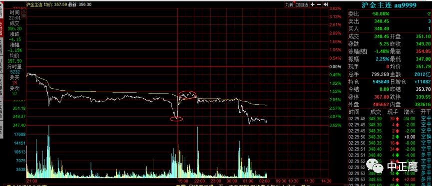 当然我还是这句话,国内的黄金期货去赌这类错位时间差的点对点主题投资不是特别合适,其风险比直接参与外盘大。如果你要坚持参与,觉得你的判断还是有把握的,国内黄金期货在周五收盘之前,也就是15:00收盘之前恰逢大幅下跌,而且跌幅也不小。此时你有胆量在低位拿一点小小的筹码,哪怕就一张多单来验证一下,用实盘验证一下自己的判断,这是可以考虑的但不是重点推荐。