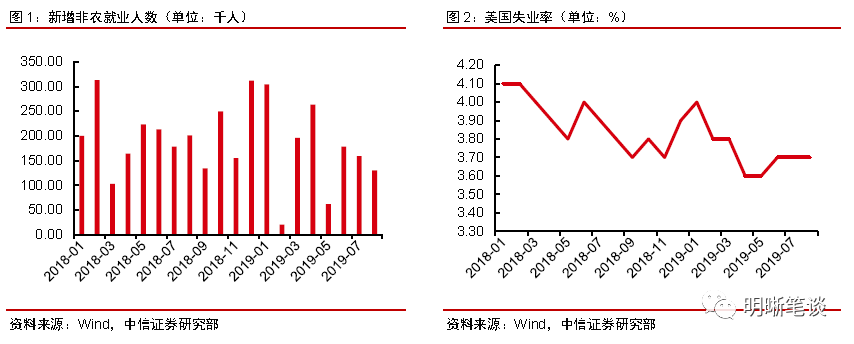9月7日晚,美国劳工部发布数据,8月新增非农就业人数13万人,为5月以来新低,预期增15.8万人,修正后的前值15.9万人;失业率保持在3.7%的水平,持平于预期和前值;平均时薪环比增长0.4%,高于0.3%的预期;同比增长3.2%,预期3.1%,略微高于预期;员工每周平均工作时长增加0.1小时,为34.4小时。劳动力参与率为63.2%,前值为63%。数据公布之后,特朗普连发数条推特督促美联储降低利率,“他们升息升的太早,降息降的太晚”。