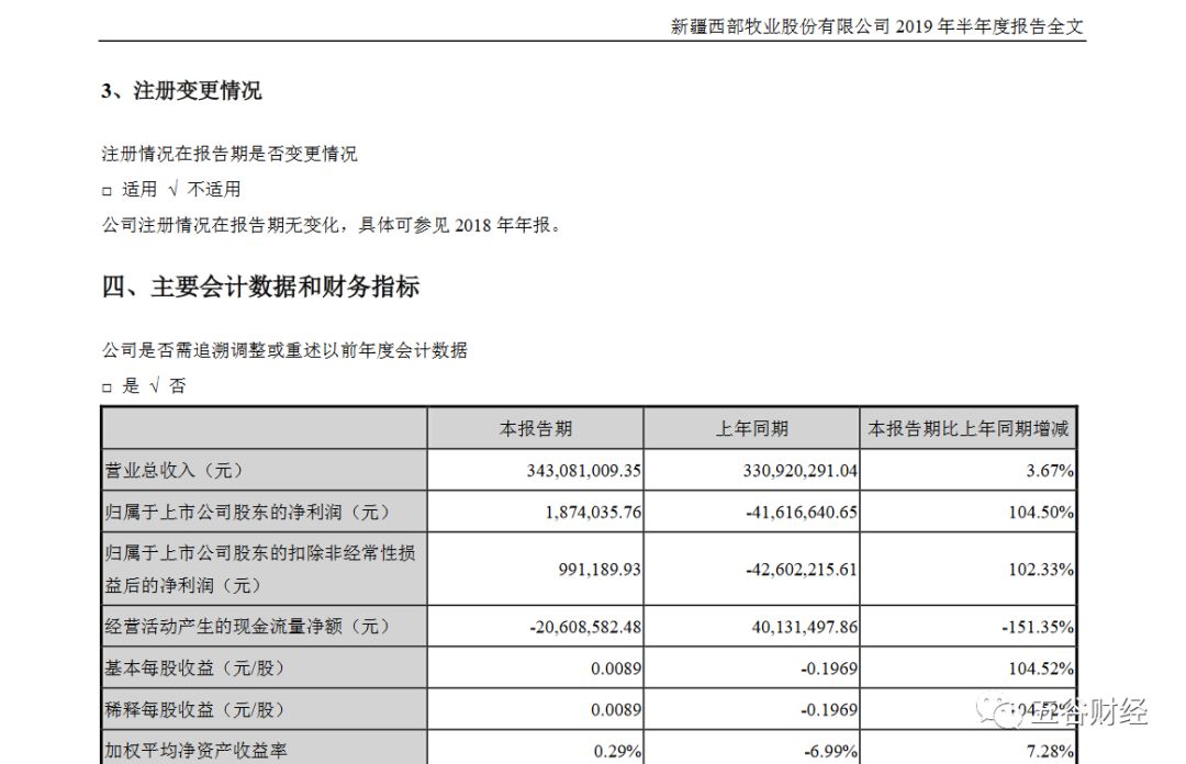 日前,西部牧业(300106.SZ)发布了2019年半年度报告,实现营业收入约为3.43亿元,与去年同期3.31亿元相比,增幅不足4%;归属于上市公司股东的净利润约为187万元,相较于2018年上半年-0.42亿元,增幅在104%以上。