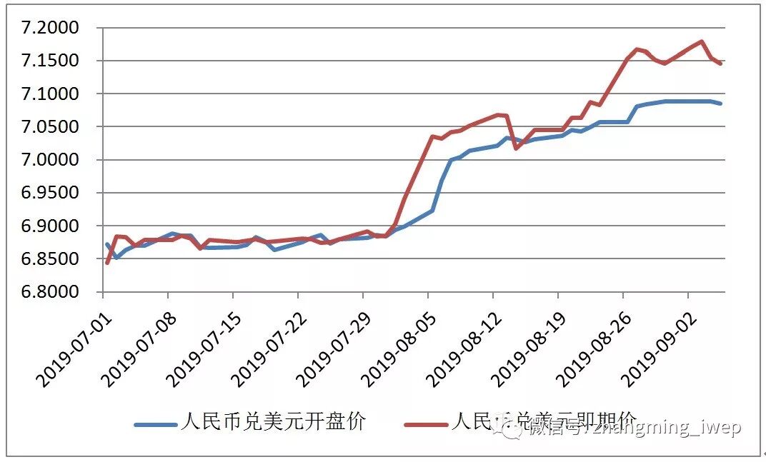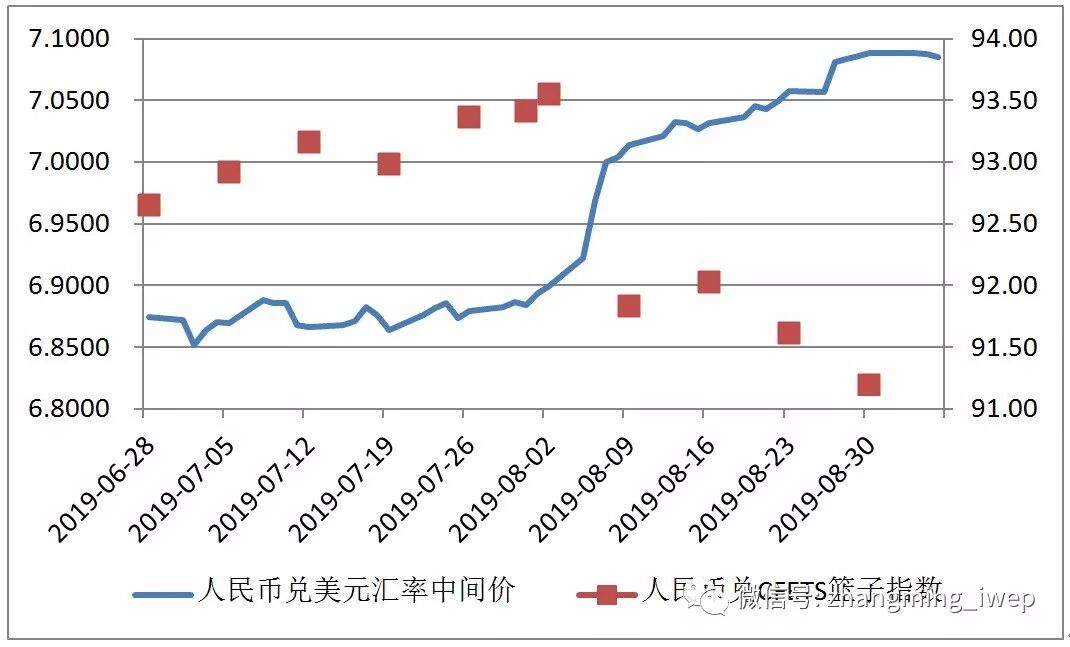 人民币兑美元汇率在同一时期内(2019年6月底至2019年9月4日)贬值了3.1%,贬值幅度相比于欧元与英镑对美元汇率而言并不算太大(略高于欧元但显著低于英镑)。不过,如图2所示,人民币兑美元汇率的贬值主要发生在8月份。单单在这个月内,人民币兑美元汇率就贬值了3.0%,人民币兑CFETS货币篮指数也贬值了2.4%。换言之,在2019年8月,人民币汇率出现了既对美元贬值也对篮子贬值的双贬现象。