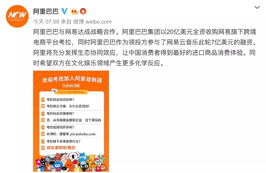 - 9月6日,阿里巴巴官方正式宣布,与网易达成战略合作,以20亿美元全资收购网易旗下跨境电商平台考拉。同时,阿里巴巴作为领投方参与了网易云音乐此轮7亿美元的融资。 阿里巴巴集团首席执行官张勇表示,天猫进