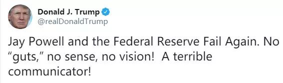 他在推特上发文称:“鲍威尔和美联储再一次失败。没胆,没常识,没远见!一个糟糕的沟通者!”