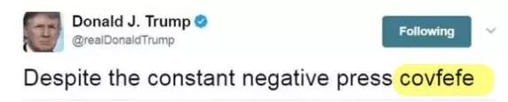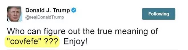 2017年5月,特朗普曾在推特上,自创了一个没人知道是什么意思的词,叫“covfefe”。