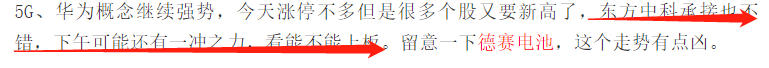 另外看下上面这段话,昨天已经告诉你们东方中科的三种走势实际上肯定不止这三种可能,但是这三种是最可能的。最好的是震荡换手充分后直线大长腿上板,今天是不是这么走的?午盘特地提示过下午还有一冲之力看能不能上板,基本走势就差不多确定了,也确实是一口气就上去了。