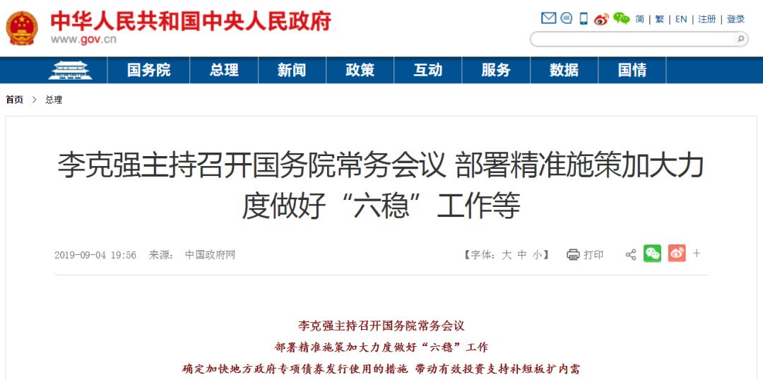 据中国政府网消息,国务院总理李克强9月4日主持召开国务院常务会议,部署精准施策加大力度做好“六稳”工作;确定加快地方政府专项债券发行使用的措施,带动有效投资支持补短板扩内需。