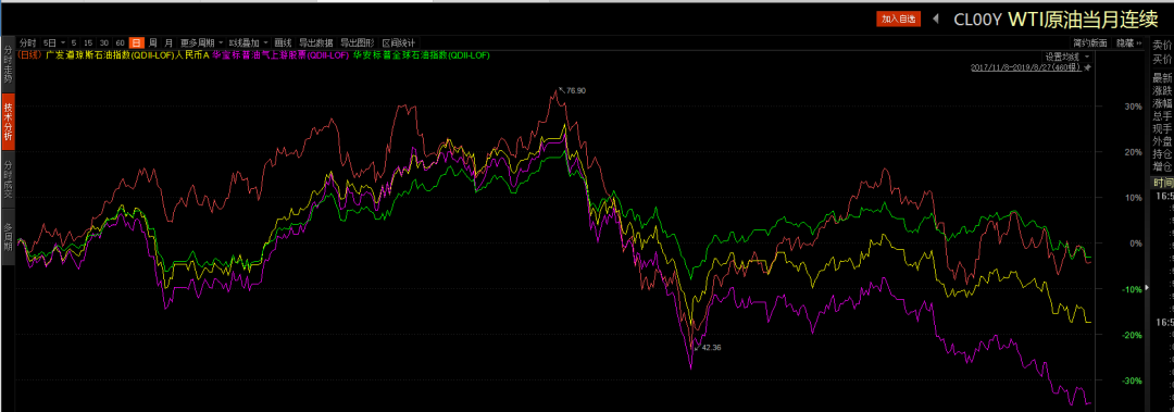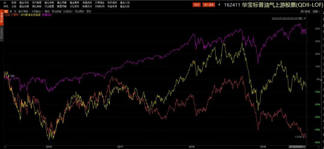 从业绩回测看,三个基金中表现最好的是绿色的华安石油,相比红色的原油期货价格,跟踪误差也是最小的,其次是黄色的广发原油,跟踪油价最差的就是紫色的华宝油气。