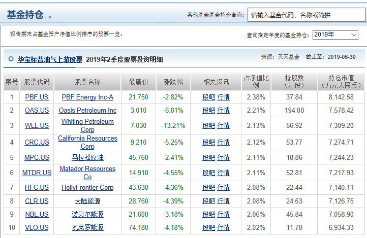 华宝油气是个追踪标普石油天然气上游股票指数(SPSIOP)的指数基金,这个指数主要选出来的是主营石油天然气勘探、采掘和生产的美国上市公司。