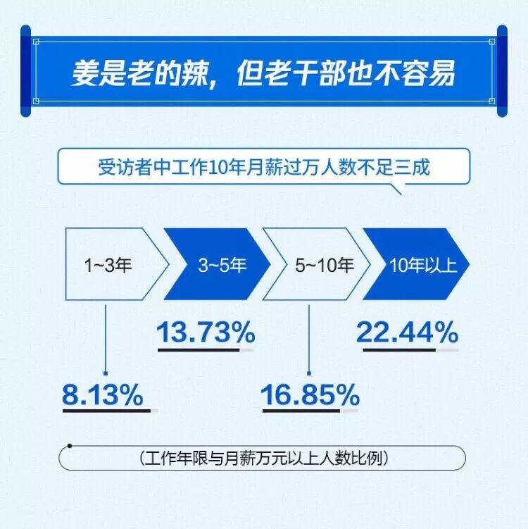 但报告也指出,受访者月薪过万人数随着工作年限递增,但工作10年月薪高于1万的人数依然不足三成。换句话说,近八成国人工作10年月薪没过万元。