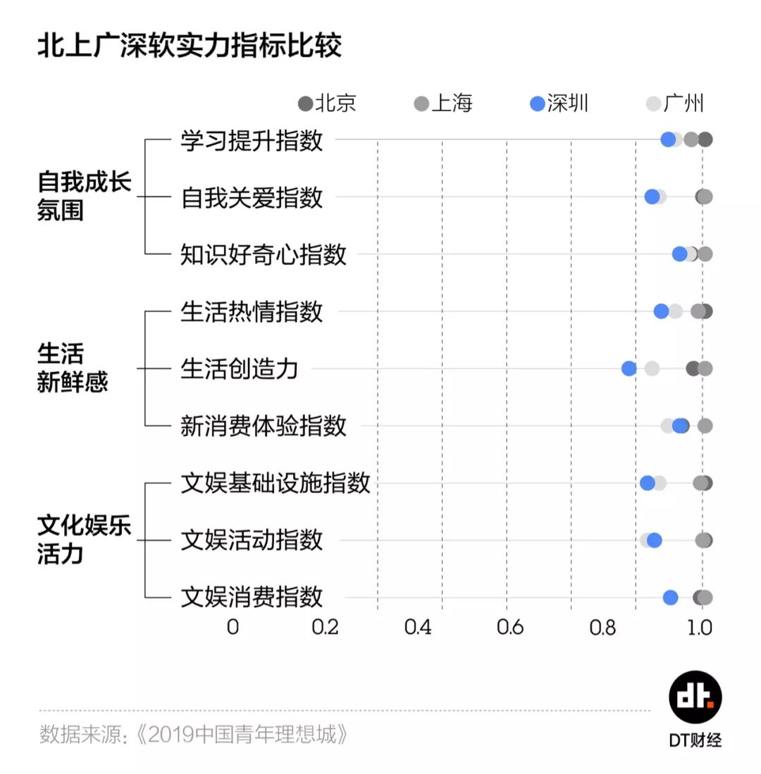 深圳除了新消费体验和文娱活动指数略胜于广州,其余各项软实力指标几乎都排在一线城市的末尾。